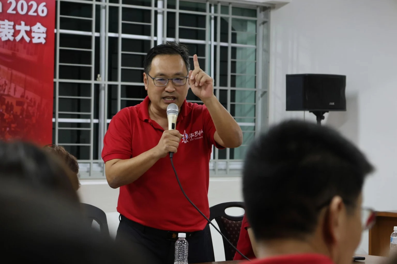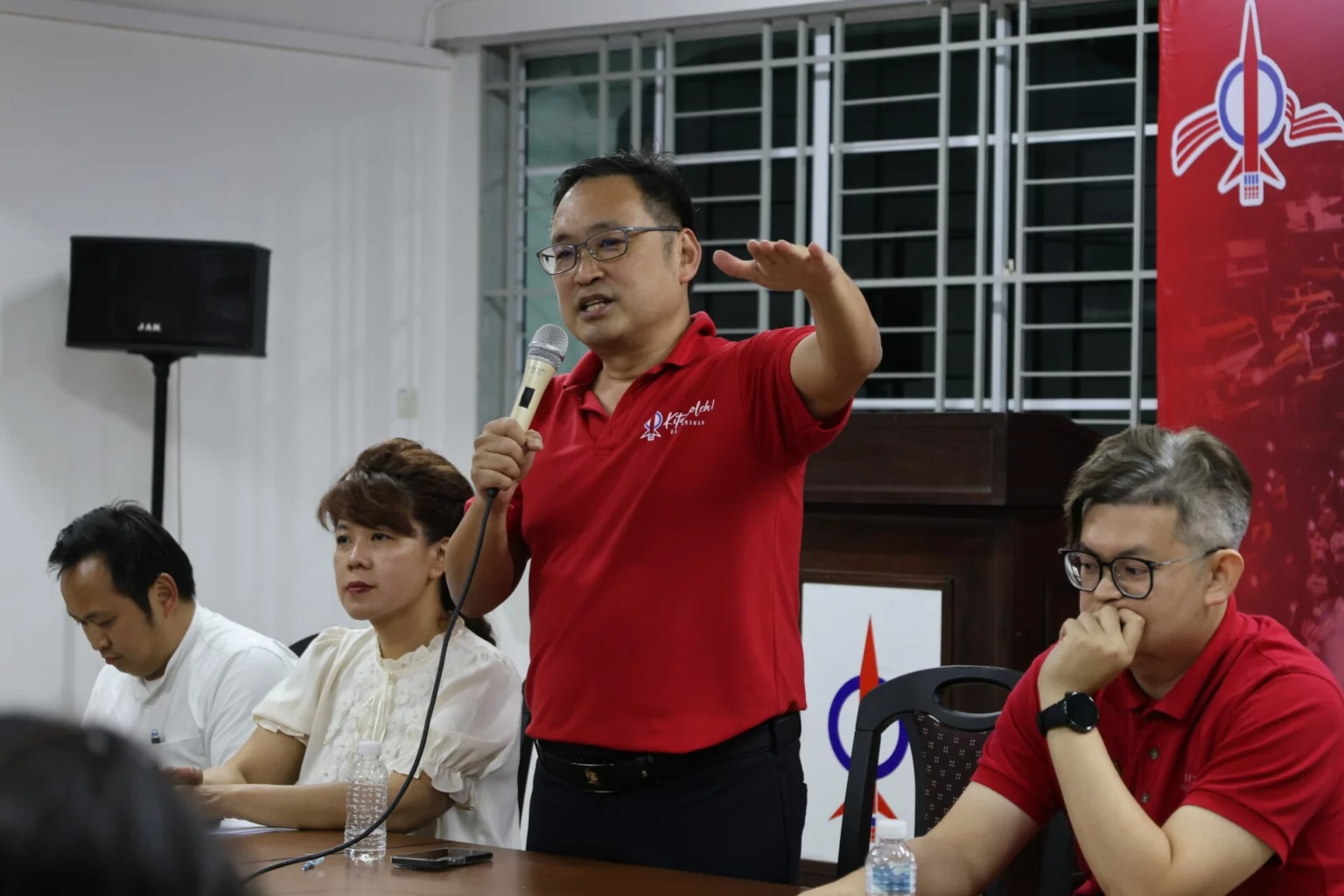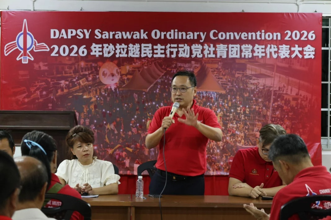砂拉越民主行动党主席兼国州议员张健仁前晚在古晋行动党支部常年大会上致词时,如...